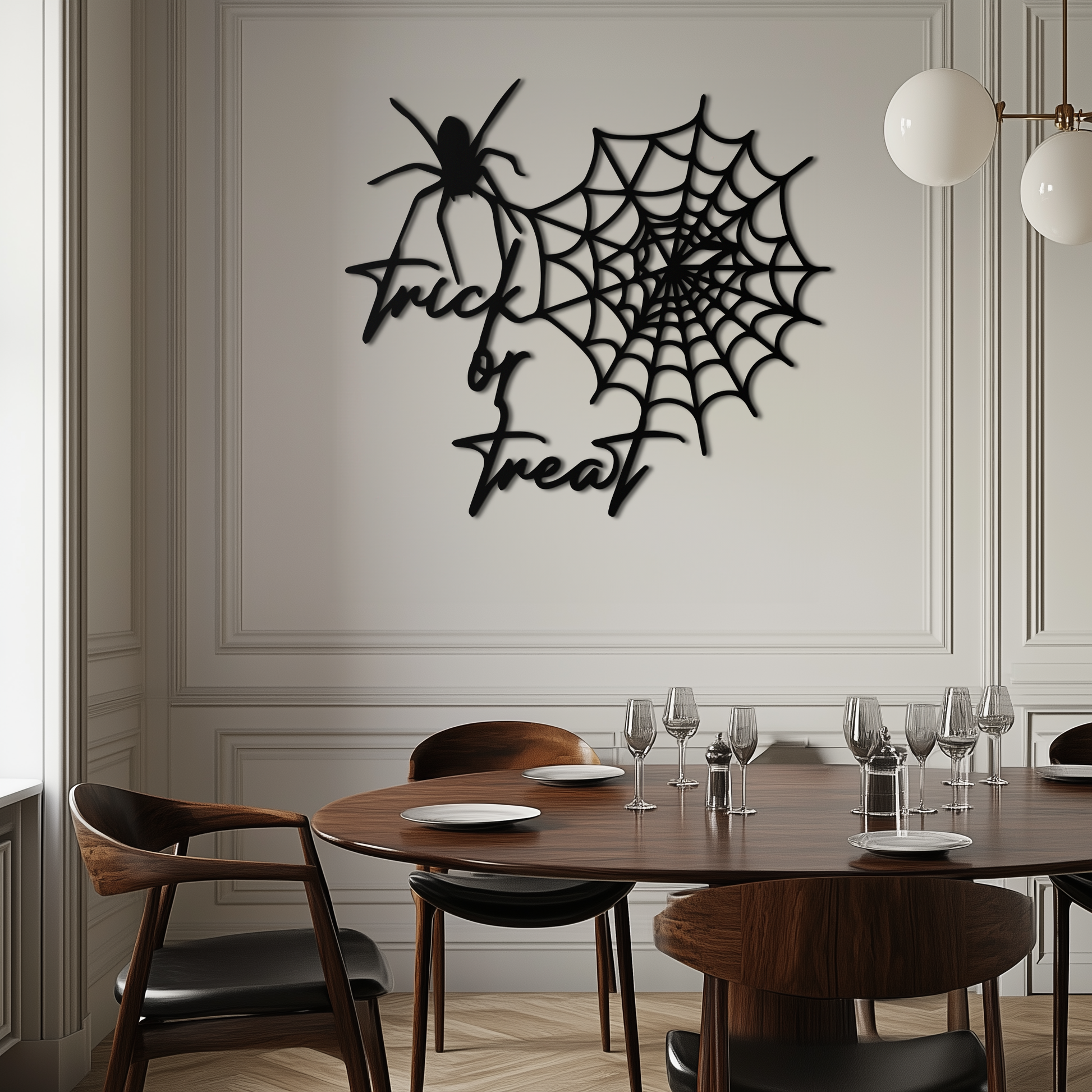Give your Halloween decor a spooky and stylish twist with this "Trick or Treat" Metal Wall Art. Featuring a detailed spider web with a hanging spider and elegantly cut script, this piece adds a hauntingly beautiful aesthetic to any space. Made from 1.5mm premium steel, this durable and high-quality sign is perfect for both indoor and outdoor use.